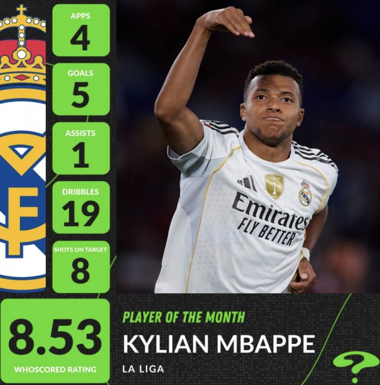 Whoscored评比西甲9月最好球员:姆巴佩4场5球1助攻见效当选