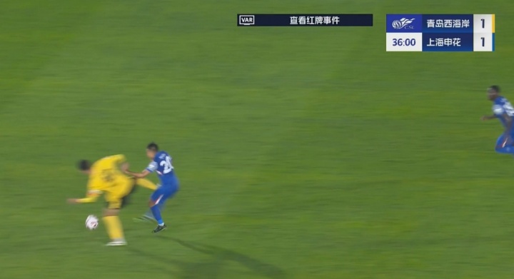10月17日讯 西海岸vs申花比赛第36分钟,孙捷亮鞋底蹬踹于汉超裆部,主裁先出示黄牌警告。