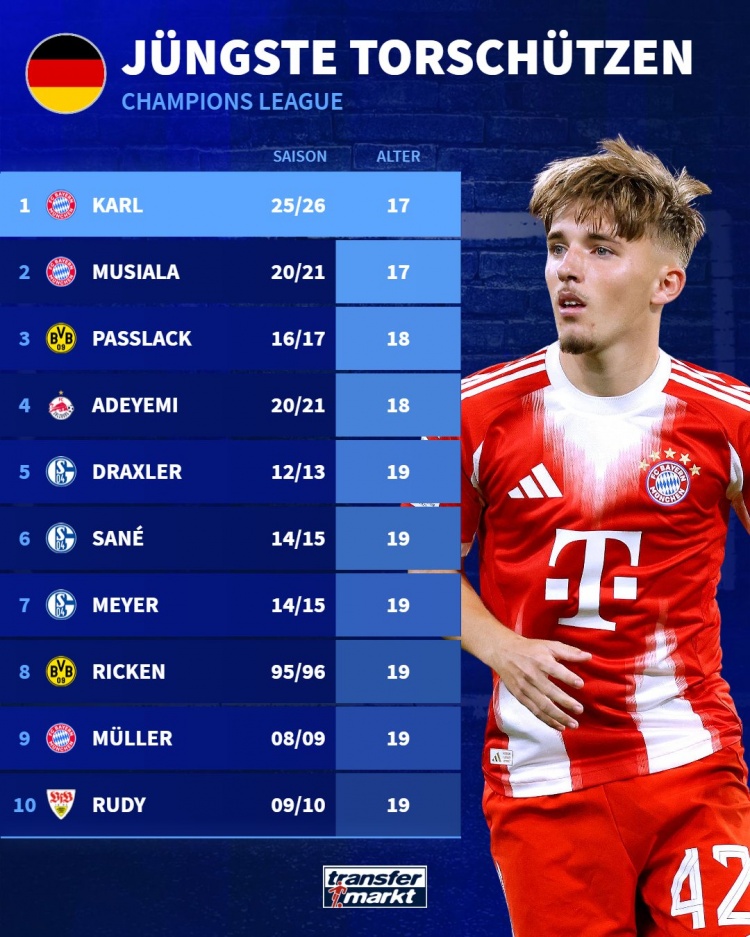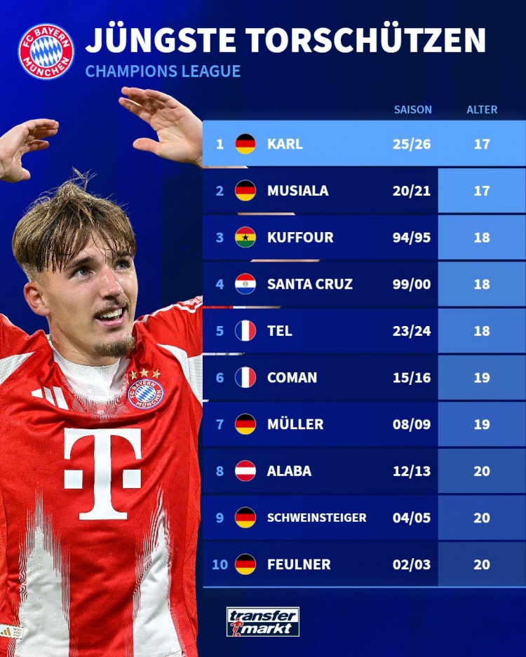 创造两项记录!伦纳特-卡尔是欧冠进球最年青拜仁球员+德国球员