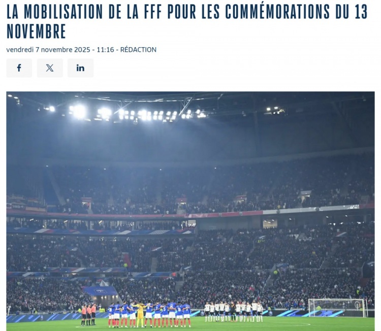 十年后,法国足协将参与寰宇性的记挂活动,向受难者问候。2025年11月13日,法国队将辞世初赛对阵乌克兰,届时将举行多项记挂活动。法国足协决定复古由13-Unis协会组织的记挂长跑活动,该活动将于11月9日在法兰西开通场举行。