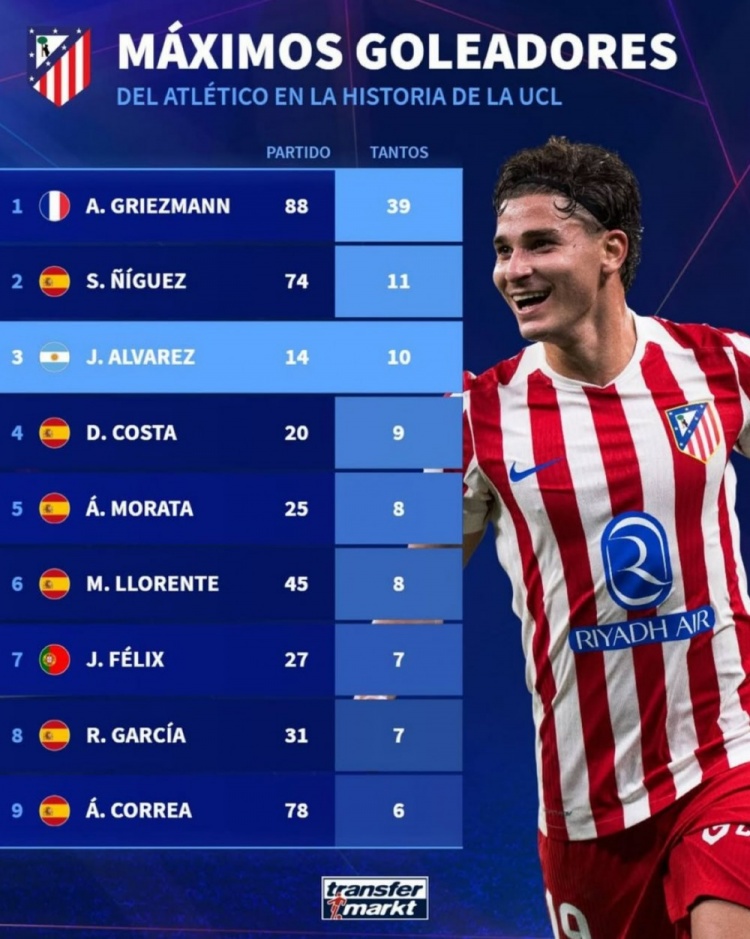 马竞队史欧冠进球榜:格列兹曼居首,阿尔瓦雷斯14场10球第三