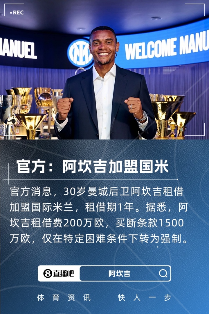 官方:国米签下阿坎吉,200万租赁+1500万有条件强制买断条目