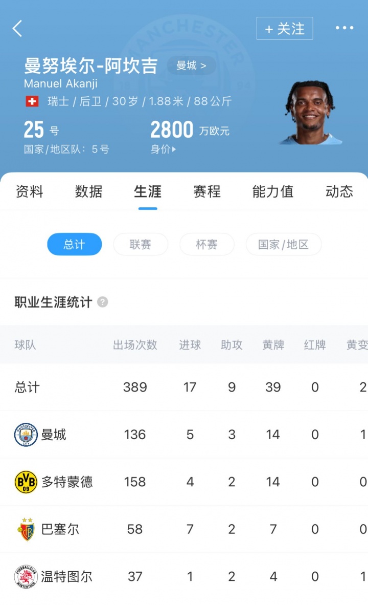 阿坎吉现年30岁,司职后卫,上赛季代表曼城各赛事出场37次,孝敬1助。现在阿坎吉德回身价为2800万欧元。
