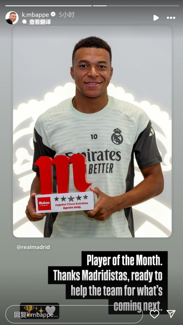 姆巴佩社媒晒入手拿最好球员奖杯的相片,配文:“月度最好球员,感谢皇马球迷,准备好在接下来的比赛中匡助球队。”