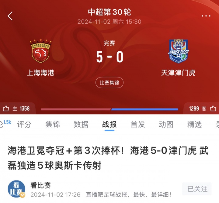 如出一辙!昨年第29轮海港超越申花1分,最终海港5-0津门虎夺冠