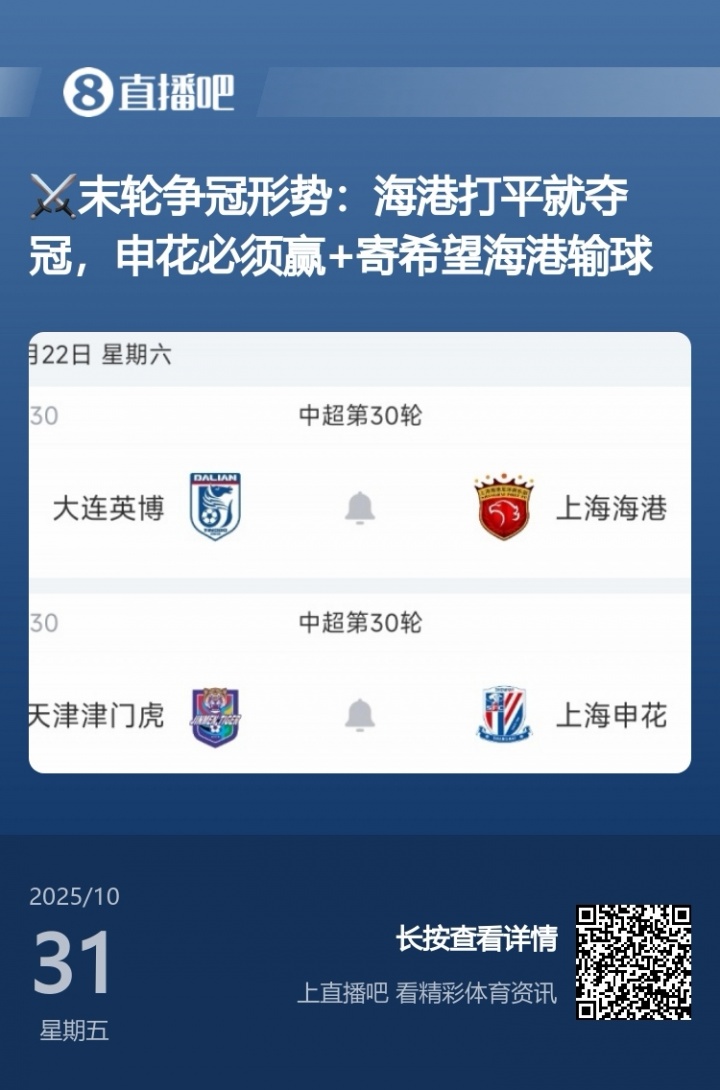 本赛季海港超越申花2分,末轮只需要打平就夺冠。
