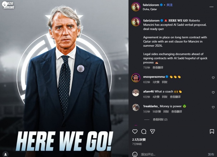 Here we go!罗马诺:曼奇尼合手教卡塔尔球队萨德,将签下长约