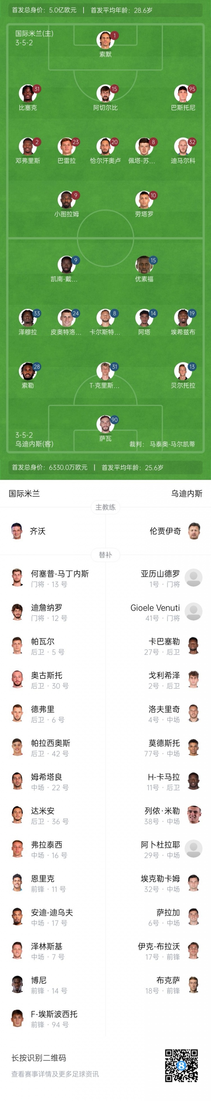 国米vs乌迪内斯首发:恰20追思,劳塔罗、图拉姆、苏西奇先发