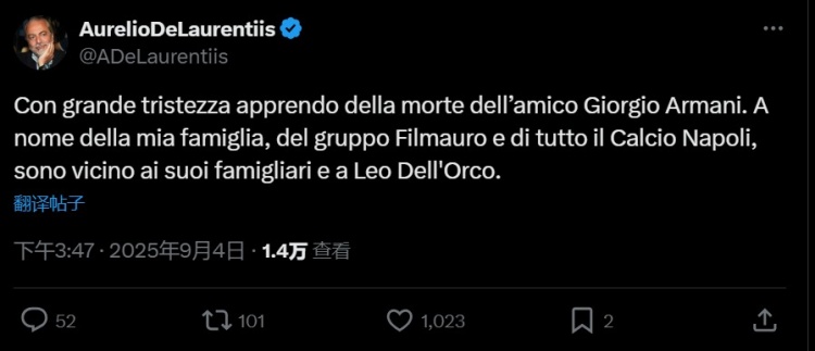 阿玛尼首创东说念主亏损,德佬吊唁:代表那不勒斯向他的家东说念主示意慰问