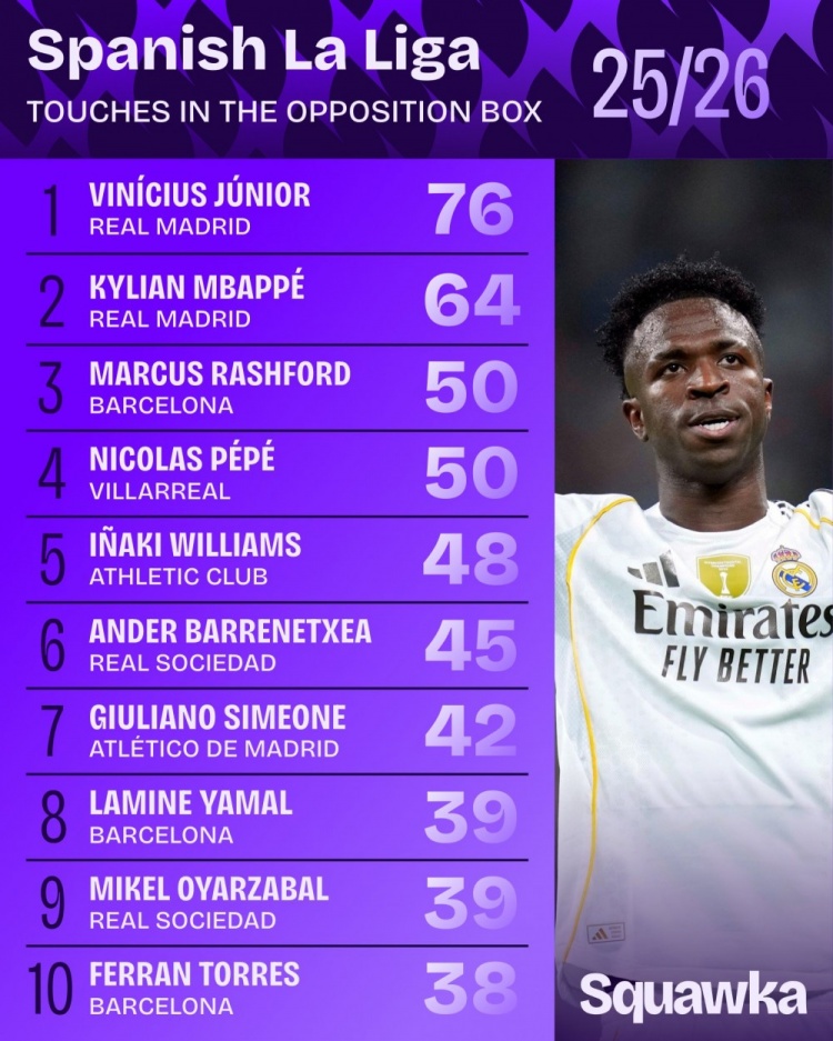西甲禁区触球数排名:维尼修斯76次居首 姆巴佩第2、拉什福德第3