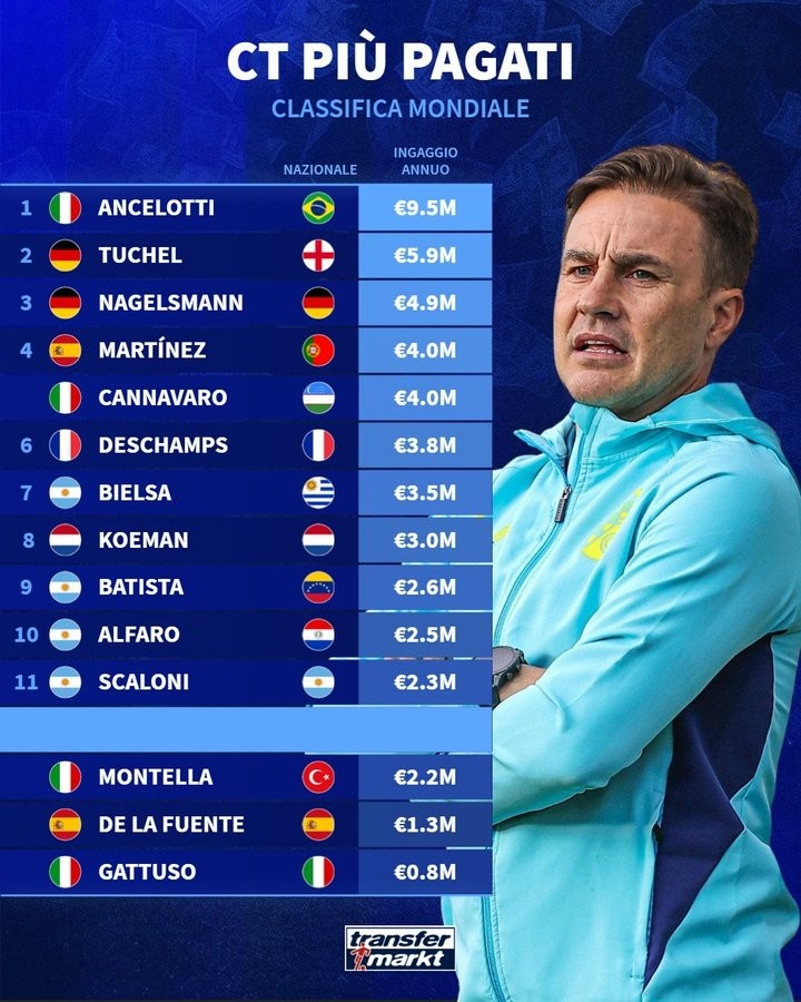 国度队主帅薪水名次榜:安帅950万欧断层第一 卡纳瓦罗400万第四