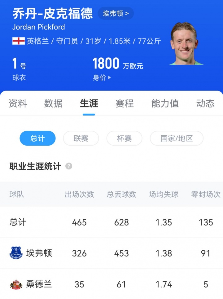 31岁的皮克福德现在依然为埃弗顿出战326场比赛,孝敬91次零封。现在他的德回身价为1800万欧元。