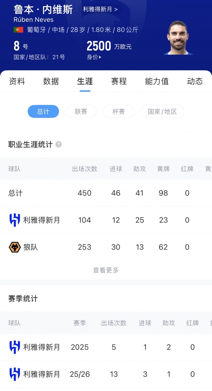 内维斯在2023年的夏窗以5500万欧的转会费从狼队加盟利雅得月牙,他现在的协议在2026年6月30日到期,球员现在身价2500万欧,本赛季他代表球队出战18场比赛孝敬4球3助,是球队的迫切球员。