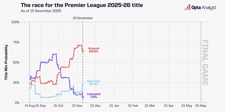 英超夺冠概率走势:利物浦从领跑跌至7%,现在阿森纳64%曼城23%