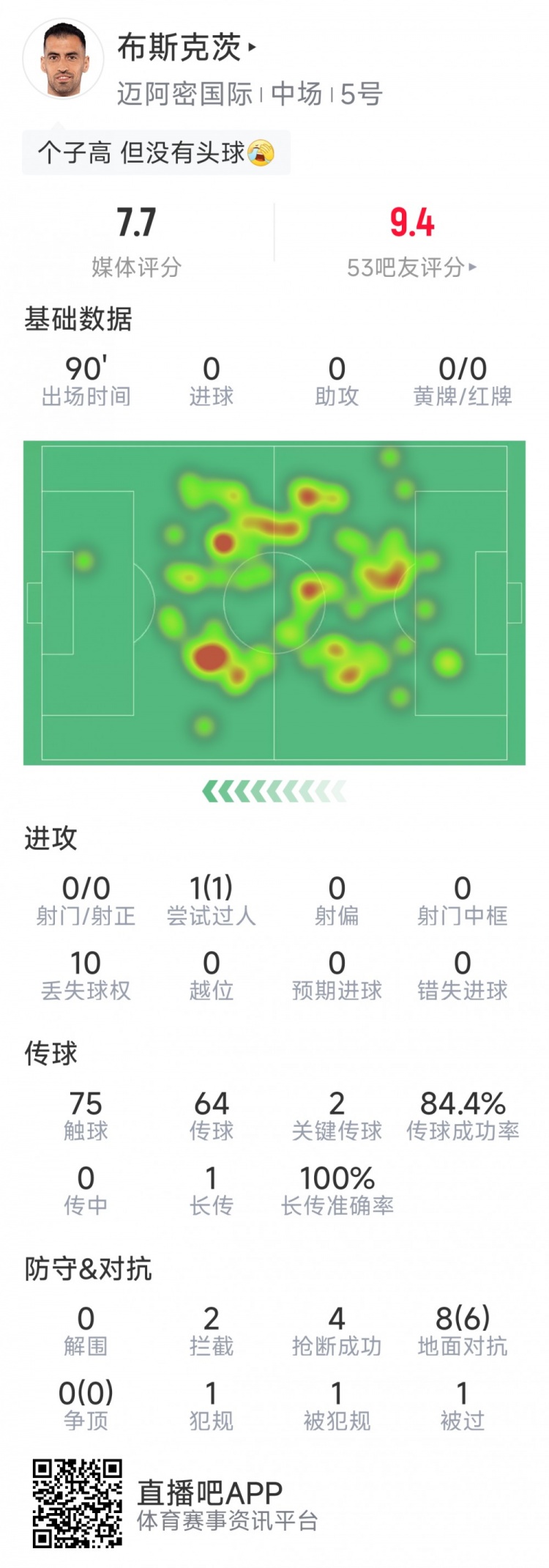 也曾端庄,布斯克茨本场数据:2次环节传球,4次抢断,8抗争6得手