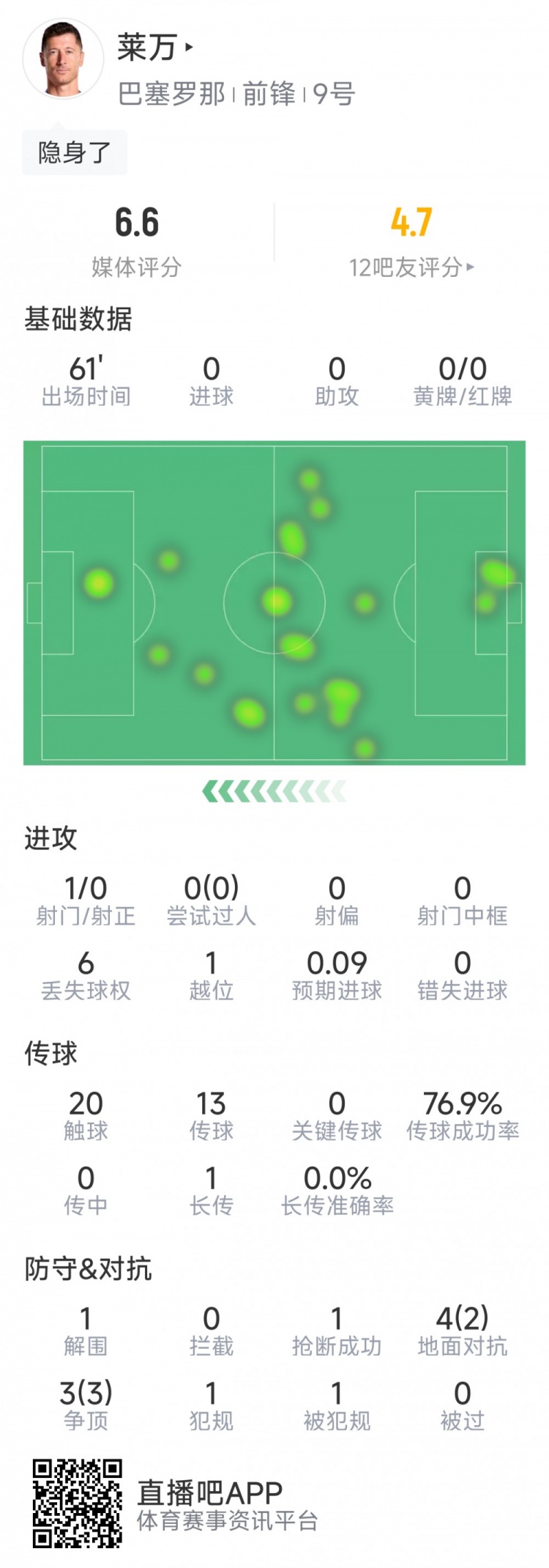 契机寥寥,莱万本场数据:1次射门0射正,7回击5得手,评分6.6分