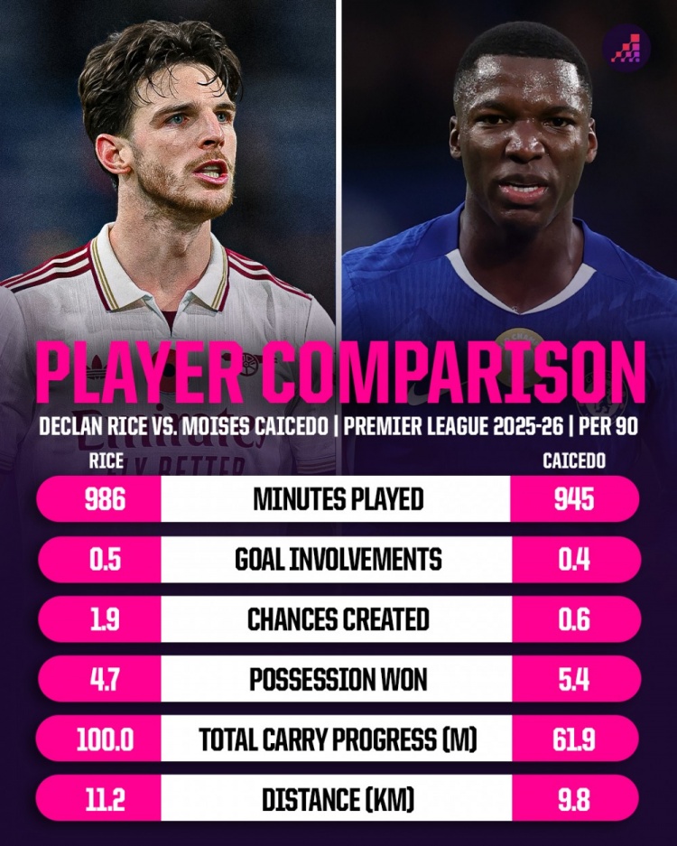 赖斯、凯塞多本赛季英超每90分钟数据: