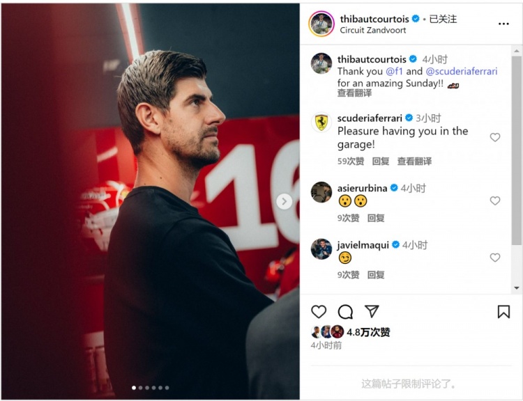 库尔图瓦受邀现场不雅看F1荷兰大奖赛,并走访法拉利车队,他在酬酢媒体上晒出像片,配文:“感谢F1和法拉利车队让我渡过一个隐讳的周日。”