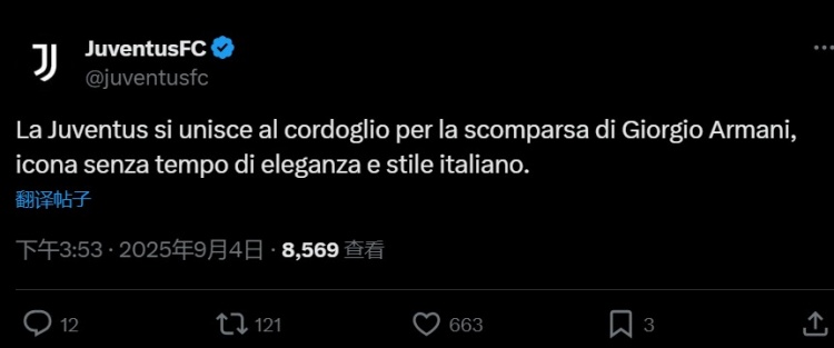 尤文臣方写谈:“尤文图斯俱乐部对乔治-阿玛尼的毕命示意悲伤,他是意大利优雅与作风的不灭标记。”