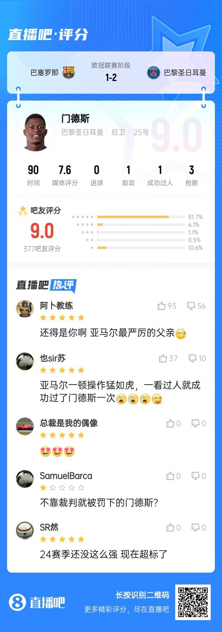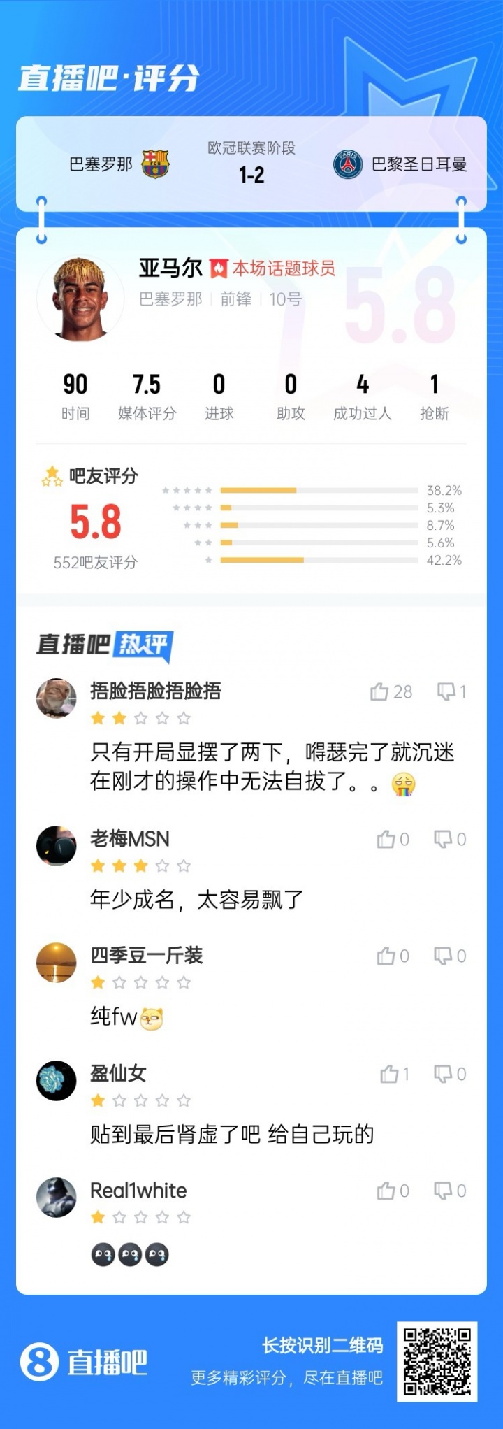 吧友们合计门德斯本场是否罢休了亚马尔的发扬?