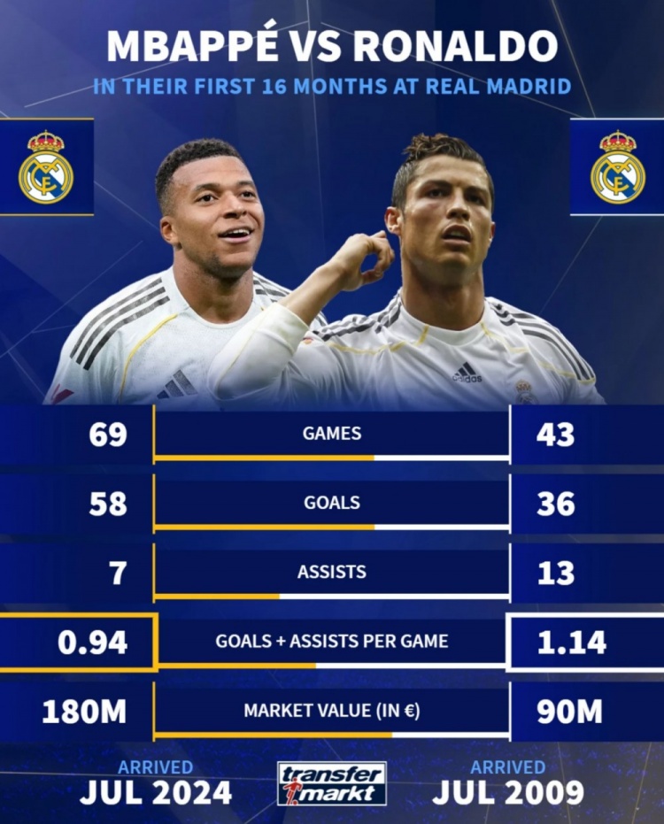 服从皇马前16个月数据:姆巴佩69场58球7助,C罗43场36球13助