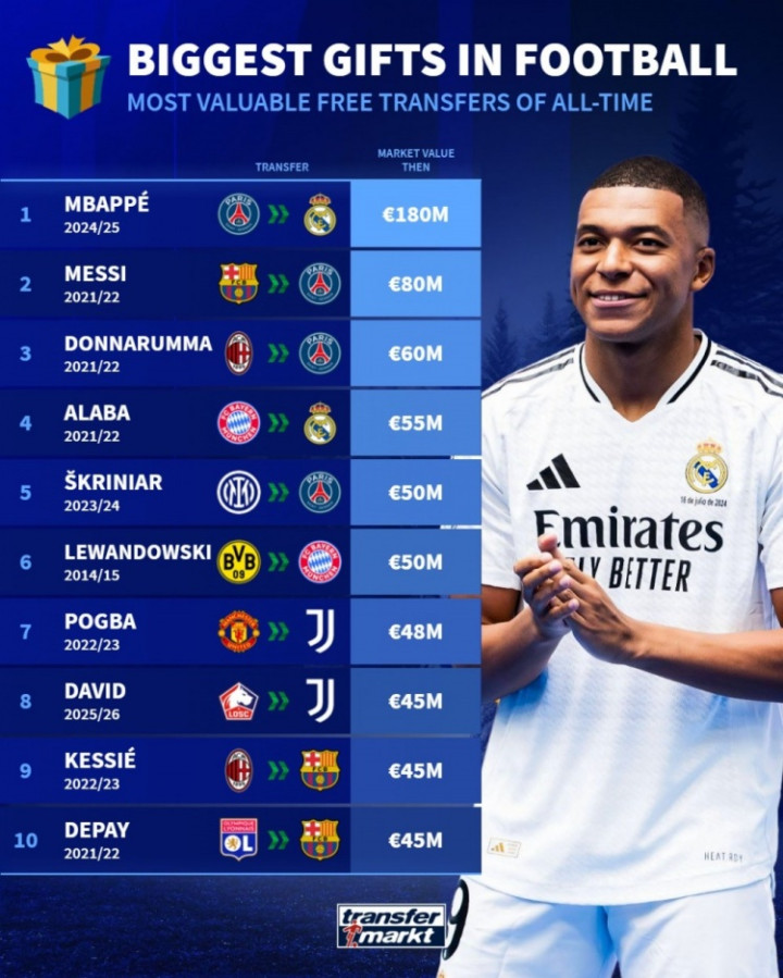 直播吧12月26日讯德国转会市集统计了足坛历史免签球员的身价,并排出榜单,姆巴佩1.8亿欧居首,梅西8000万欧次席。
