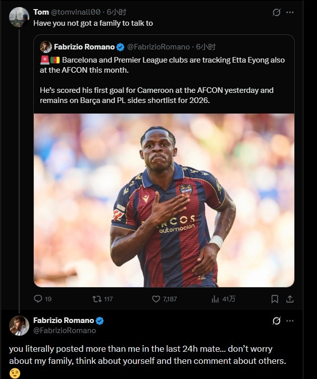 网友用这种带有袭击性的神志嘲谑罗马诺,也引起本东说念主的回话,他写说念:“你在往常24小时发的贴比我还多,哥们……别追忆我的家东说念主巴黎圣日耳曼,先思思你我方,再指摘别东说念主”