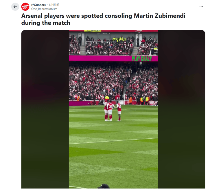 虎扑04月11日讯据英格兰媒体《Football.London》阿森纳主场作战 1-2不敌伯恩茅斯的赛事 中,领队 赖斯被镜头捕捉到多次安慰表现低迷的搭档祖比门迪。这位去年夏天以6000万英镑从皇家社会加盟的西班牙中场球员度过了噩梦般的一个下午,而赖斯则用行动诠释了领袖担当。
