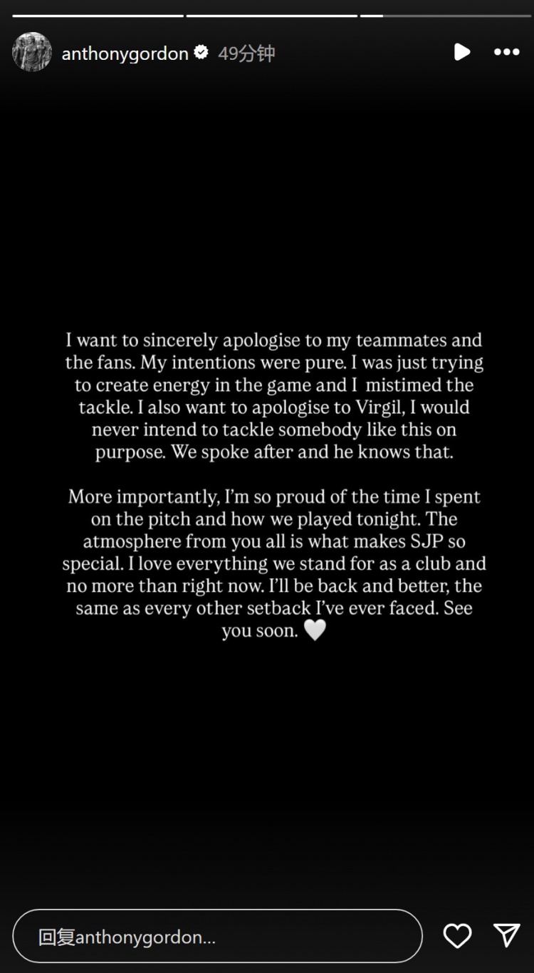 戈登赛后在外交媒体上写谈:“我念念要真挚地向我的队友和球迷们谈歉。我的意图很单纯,我仅仅念念在比赛中引发一些活力,但此次铲球时机把抓得不好。我也要向范迪克谈歉,我毫不会有益这么铲东谈主。咱们之后聊过,他知谈这极少。