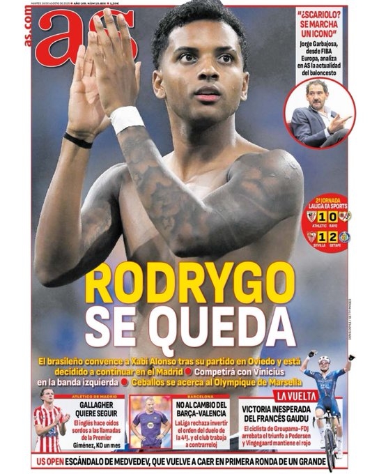 封面流露,这位巴西东谈主劝服了哈维-阿隆索,在对阵奥维耶多的比赛之后,他决定连续留在皇马。他将在左边路与维尼修斯竞争。塞巴略斯则接近加盟马赛。