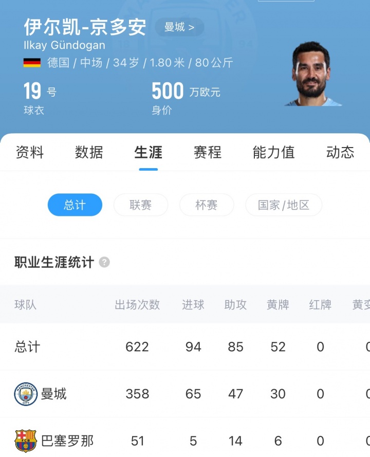 京多安现年34岁,现身价500万欧,他与曼城的合同来岁到期,上赛季他为曼城出场50次,孝敬3球7助。