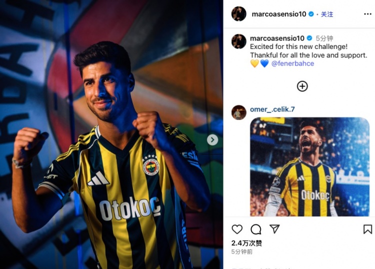 本日阿森西奥在社媒晒出了我方身穿费内巴切球衣的亮相照,并配文写说念:“很情愿迎来此次全新的挑战!感谢你们的爱与维持。@费内巴切”