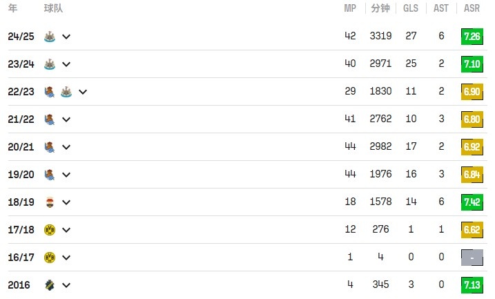 特等是近两个赛季,他在纽卡完成了40战25球、42战27球的竖立,这进球王法真的是很高了。