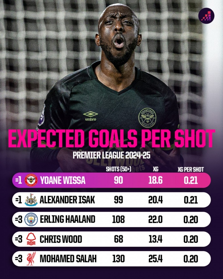 每次射门瞻望进球数,伊萨克跟维萨名依次一