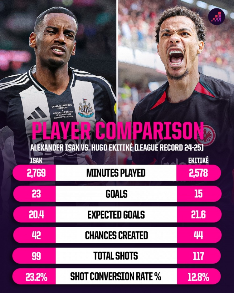 在纽卡,伊萨克主打的只好中锋位置,莫得其他谜底的,到新队后,斯洛特会给他安排到类似奇迹这没问题。可要道问题是他们也引入了埃基蒂克这名中锋球员,且他在赛季开打后景况很好,完整贬责我方被批的、射门实力一般问题,这样来看,哥俩似乎有点类似。