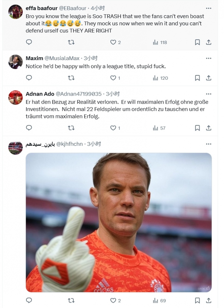 09月04日讯 拜仁主席海纳继承媒体的采访,被问到了球队本赛季的谋划,海纳说念到拜仁本赛季谋划是男足+女足+篮球队齐得到国内联赛冠军,却只字未提欧冠,这遭到拜仁球迷怒喷。