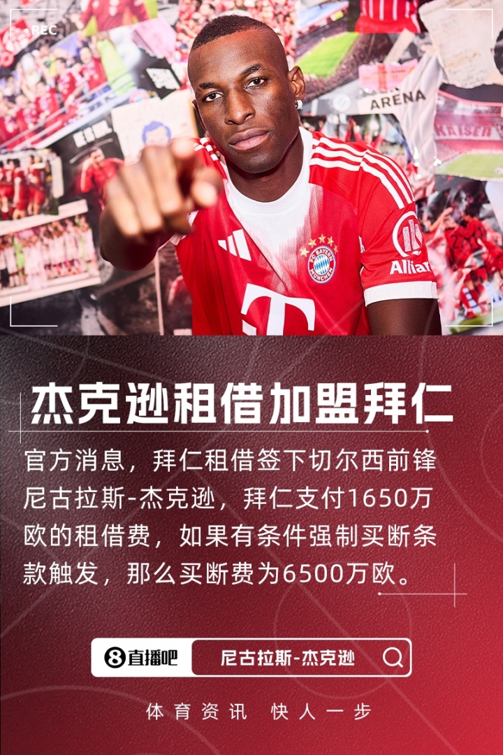 切尔西先锋杰克逊租赁加盟拜仁,据悉租赁费1650万欧元,有条目的强制买断用度6500万欧元。