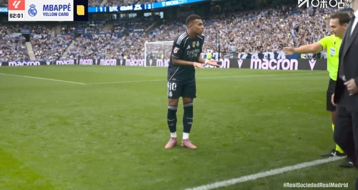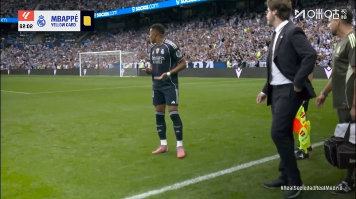 09月13日讯 皇马vs皇家社会比赛第62分钟,姆巴佩倒地接管调理。调理范围后,裁判暗示他从底线处暂时离场,姆巴佩走至边线处,被裁判出示黄牌。