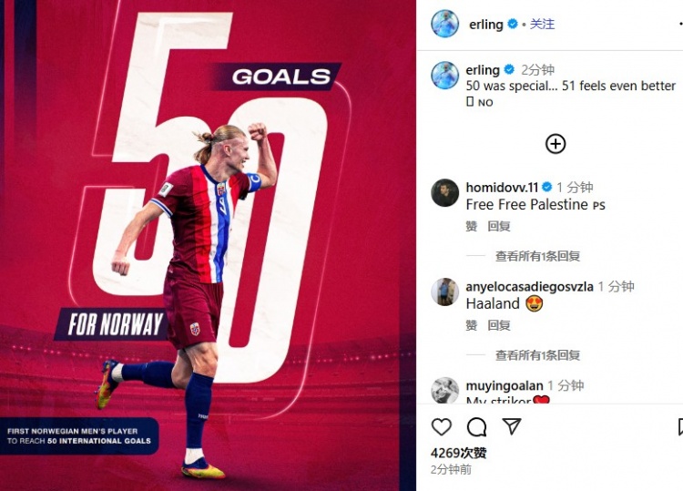 哈兰德在社媒配文中写说念:“第50球很止境……但第51球的嗅觉会更好😉🇳🇴”