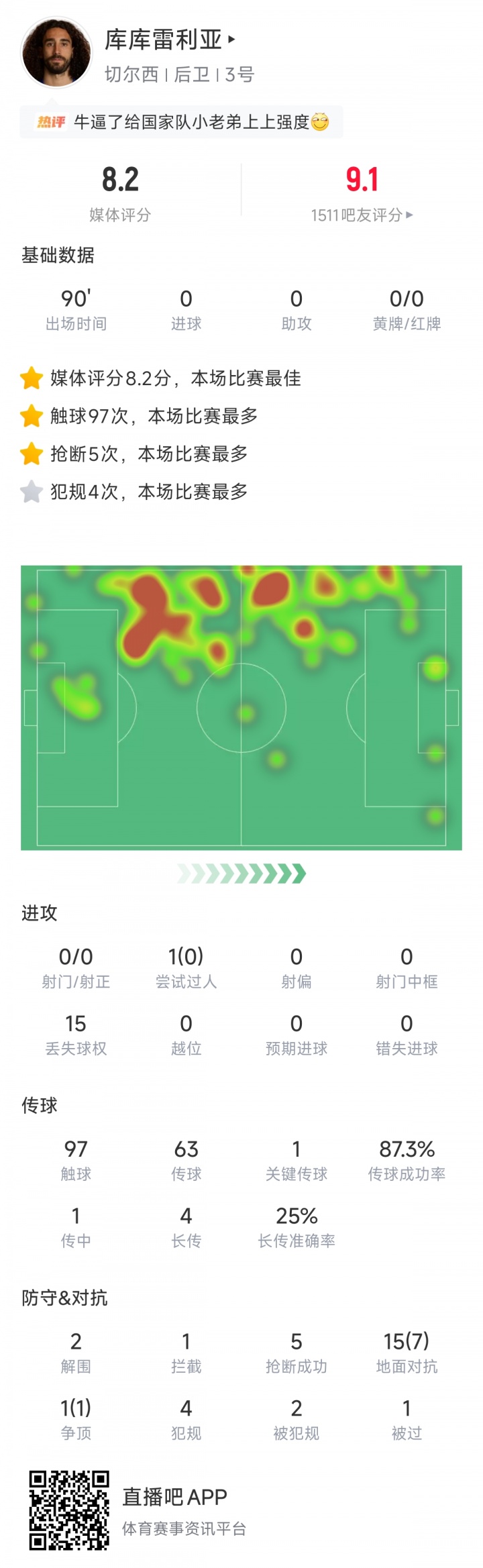 这一战库库雷利亚孝敬5次抢断2突围1阻碍,16次回击8次胜仗,他也胜仗当选欧冠官方评比出的本场比赛最好球员。切尔西的首粒进球便是来自他的传中蓄意造乌龙,赛后库库雷利亚的评分亦然最高。