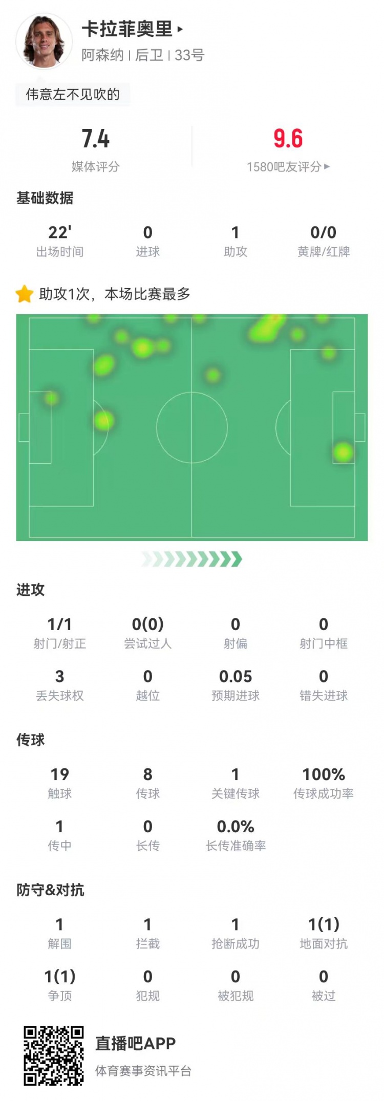 11月27日讯 阿森纳在本轮欧冠3-1力克拜仁,卡拉菲奥里本场数据如下: