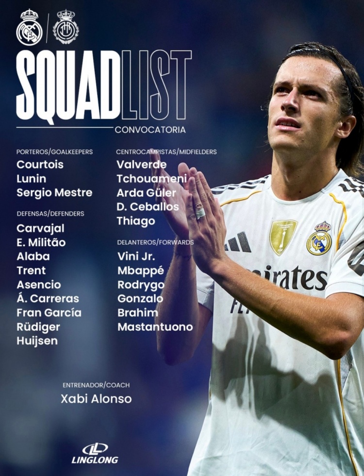 皇马公布对阵马洛卡名单:姆巴佩领衔,维尼修斯、罗德里戈在列