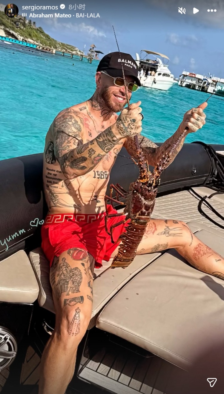 8月26日讯 拉莫斯在个东说念主社媒晒出我方假期安闲的像片,并与拿获的龙虾合影。